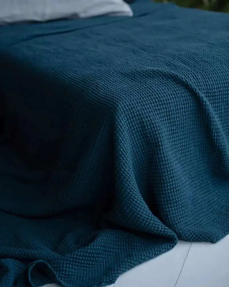 Diese dunkelblaue Leinen Decke aus Leinen-Baumwoll-Mischung verbindet weiche Haptik mit natürlicher Atmungsaktivität. Die strukturierte Waffeloptik sorgt für elegante Tiefe, während das großzügige Format von 215×230 cm sie ideal als Tagesdecke, Sofa Überwurf oder Leinen Plaid macht. Vorgewaschen für besondere Weichheit, temperaturausgleichend und langlebig – perfekt für stilvolle, natürliche Wohnräume.
